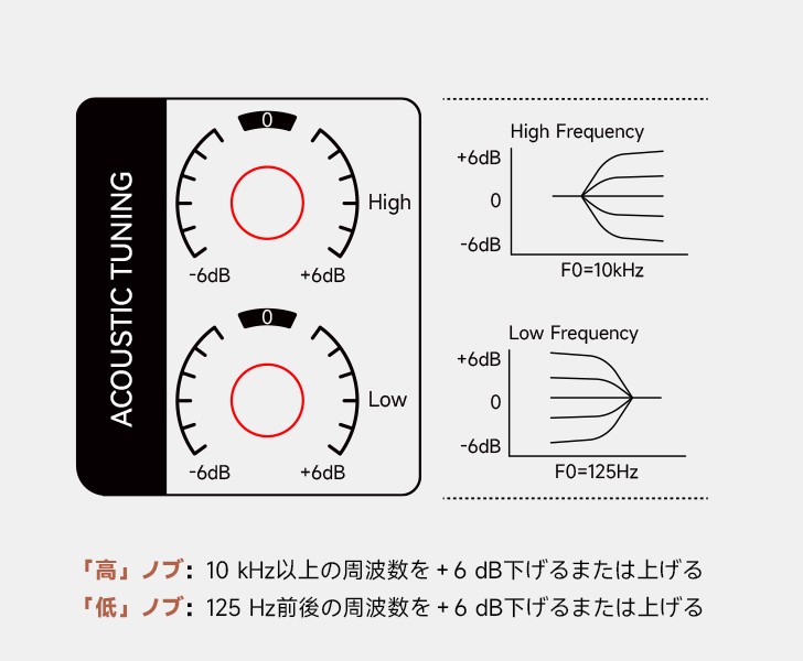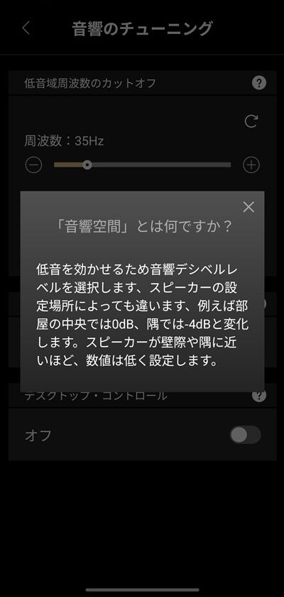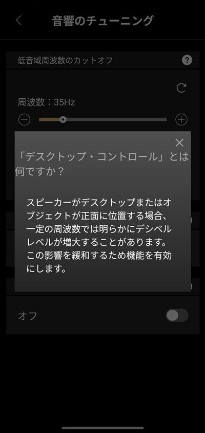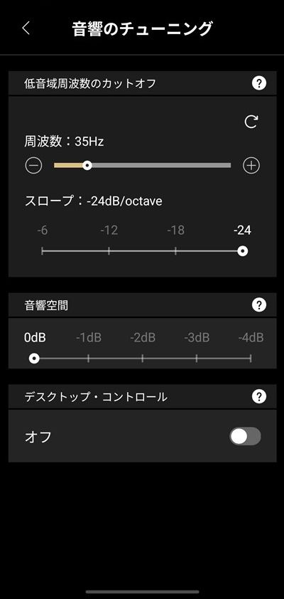 イコライザーの音響のチューニングでは、低音のカットオフや強調設定、デスクトップ環境に最適化する「デスクトップコントロール」のオン/オフも設定できます。