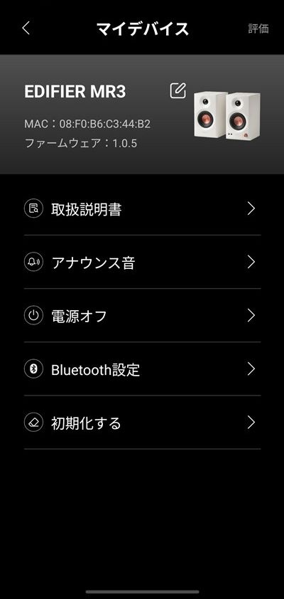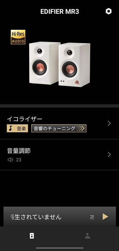 Edifier MR3は専用スマホアプリに対応していて、スマートフォンから本体の設定や操作を行うことができます。主に「イコライザー設定」と「音量調整」が可能です。