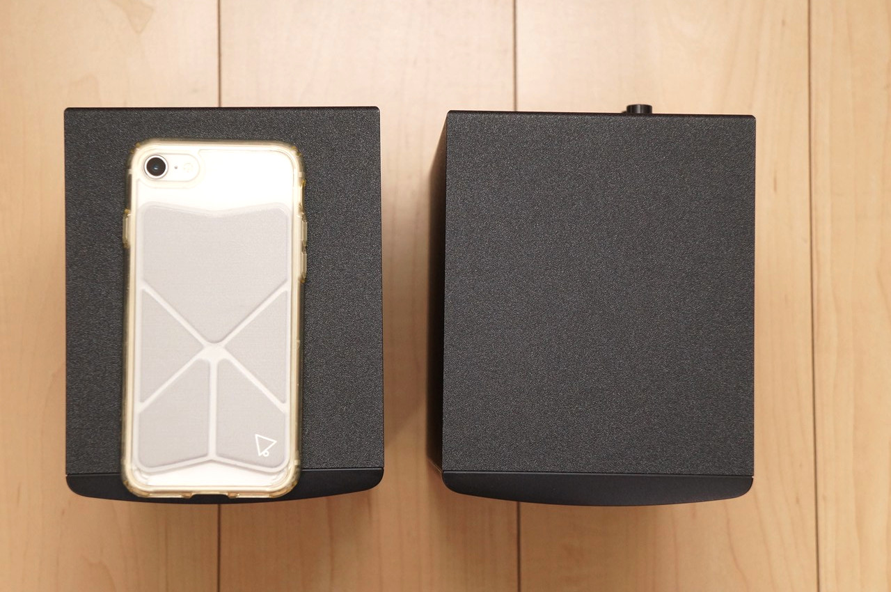 まずサイズ感ですが、iPhone SE(第3世代)とくらべてみました。コンパクトさが伝わるかと思います。奥行きはわずかiPhoneより約1cm大きい程度で、限られたデスクスペースにも設置しやすい設計です。右スピーカーが125.5×185×220mm、左スピーカーが125.5×176×220mmと、左右でわずかにサイズが異なります。