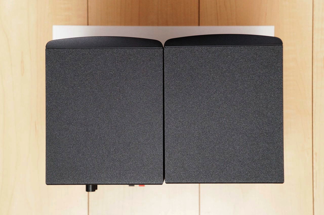 カラーバリエーションはブラックホワイトの2色。今回レビューしているのはブラックモデルで、マットな質感が上品です。エンクロージャー(筐体部分)はMDF素材(木材繊維を圧縮したもの)で作られており、共振を抑えたしっかりした作りです。