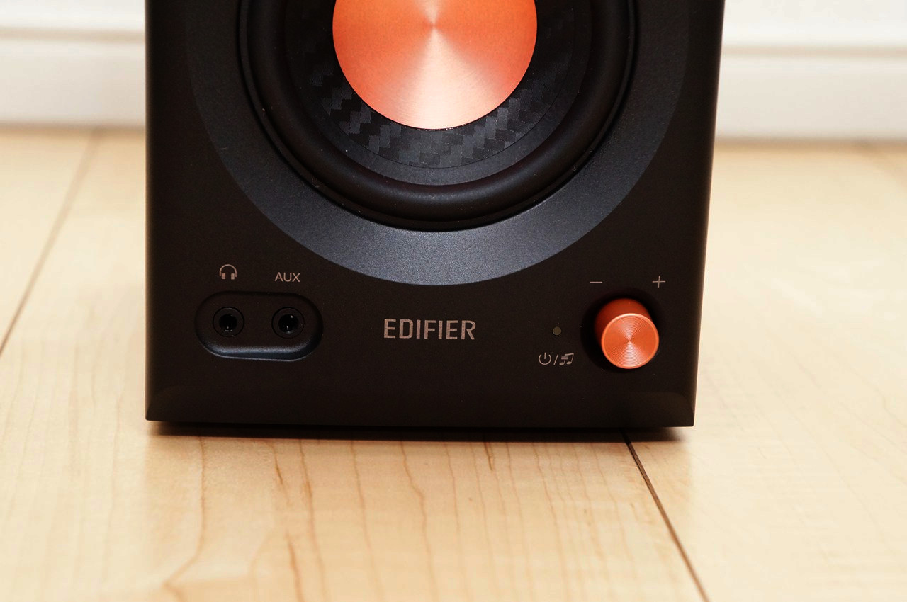 右スピーカーの下部には「Edifier」ロゴのほか、電源兼音量ノブ、AUX入力端子、ヘッドホン出力端子が並んでいます。