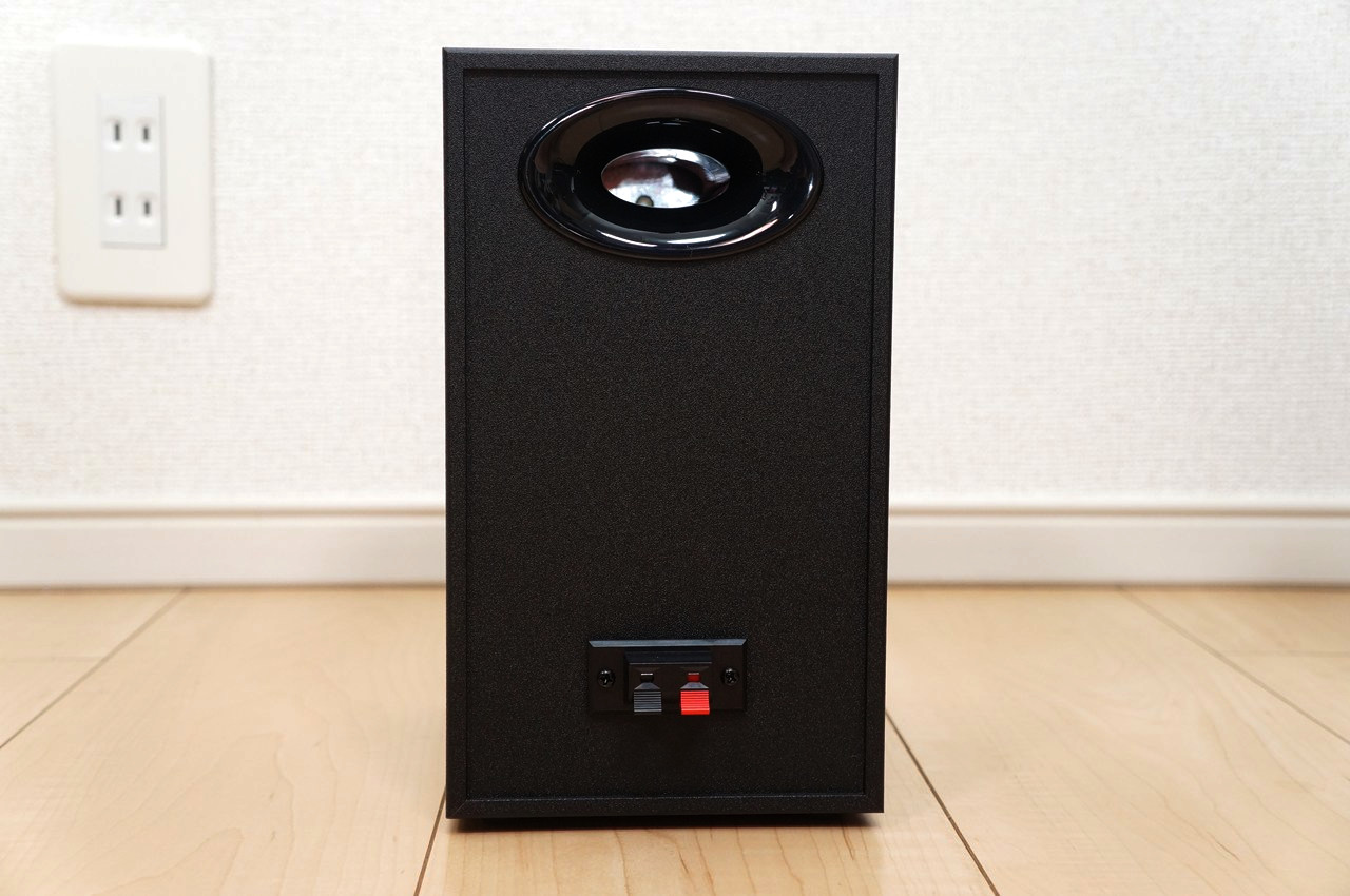左スピーカーも右側と同じ2ウェイ構成で、背面にはバスレフポートとスピーカーケーブル用端子が配置されています。