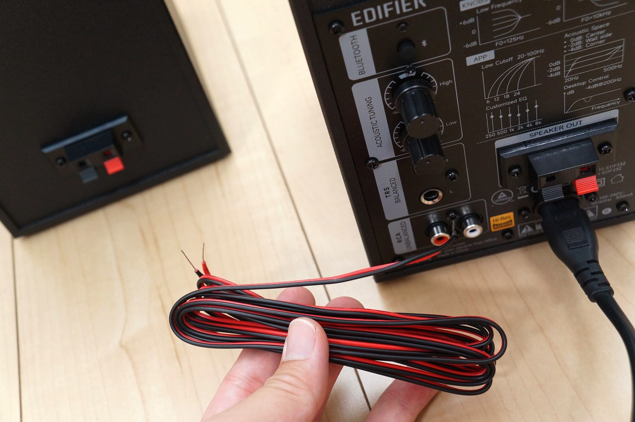 付属のスピーカーケーブルで左右のスピーカーを接続します。