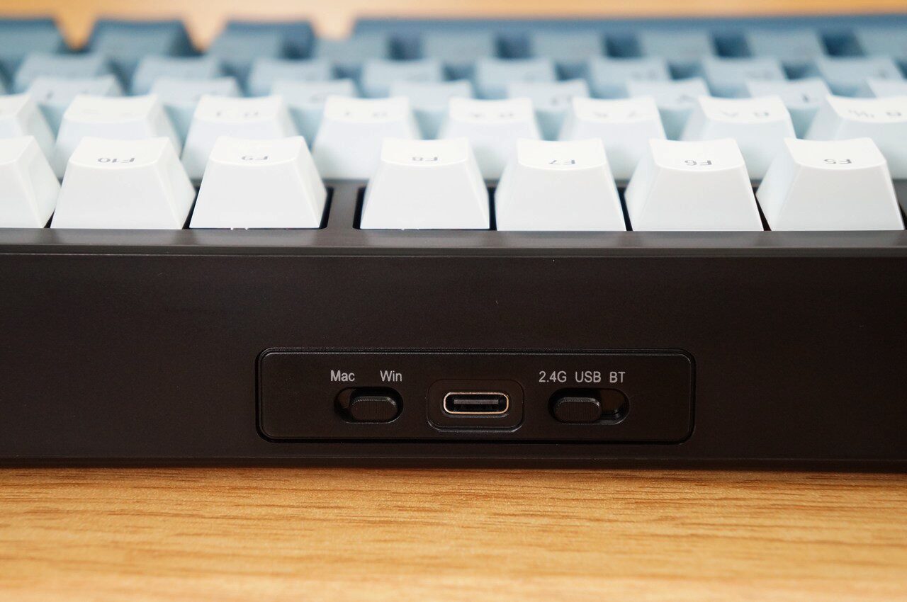 背面上部にある接続ポートとスイッチ類です。Win/Macの切り替えや、Bluetooth・2.4G・有線の切り替えが物理スイッチで直感的に行えます。