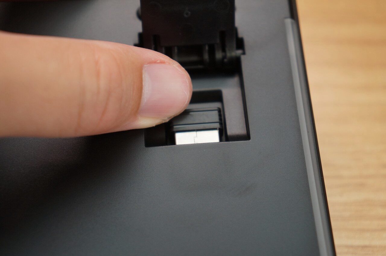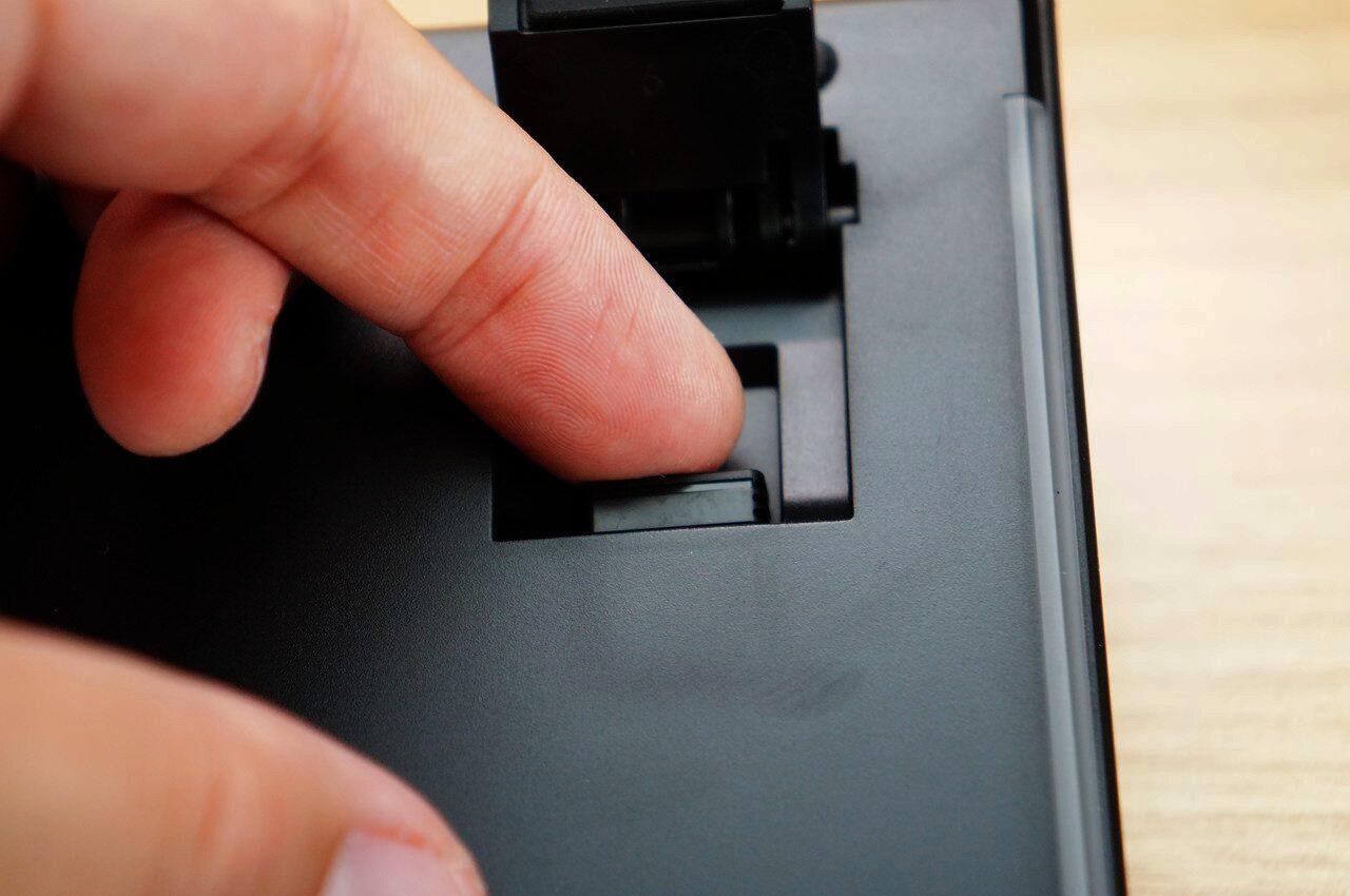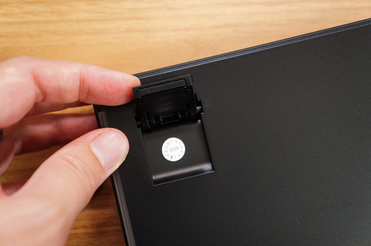 チルトアップ用のスタンドは二段階式です。スタンド自体の作りもガッチリしていて、タイピング中にパタンと倒れる心配はありません。