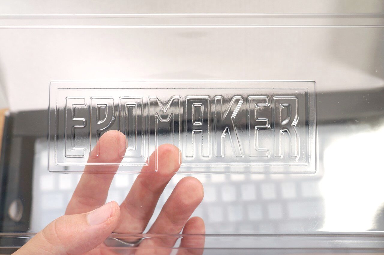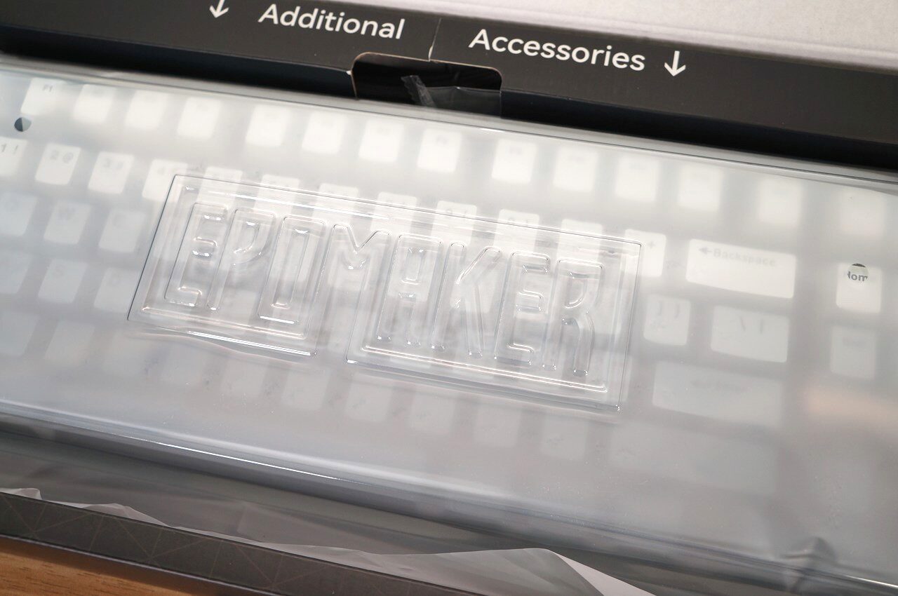 キーボードは透明なダストカバーに包まれた厳重仕様です。ありがたい。ダストカバーには「EPOMAKER」のロゴがエンボス加工されていました。