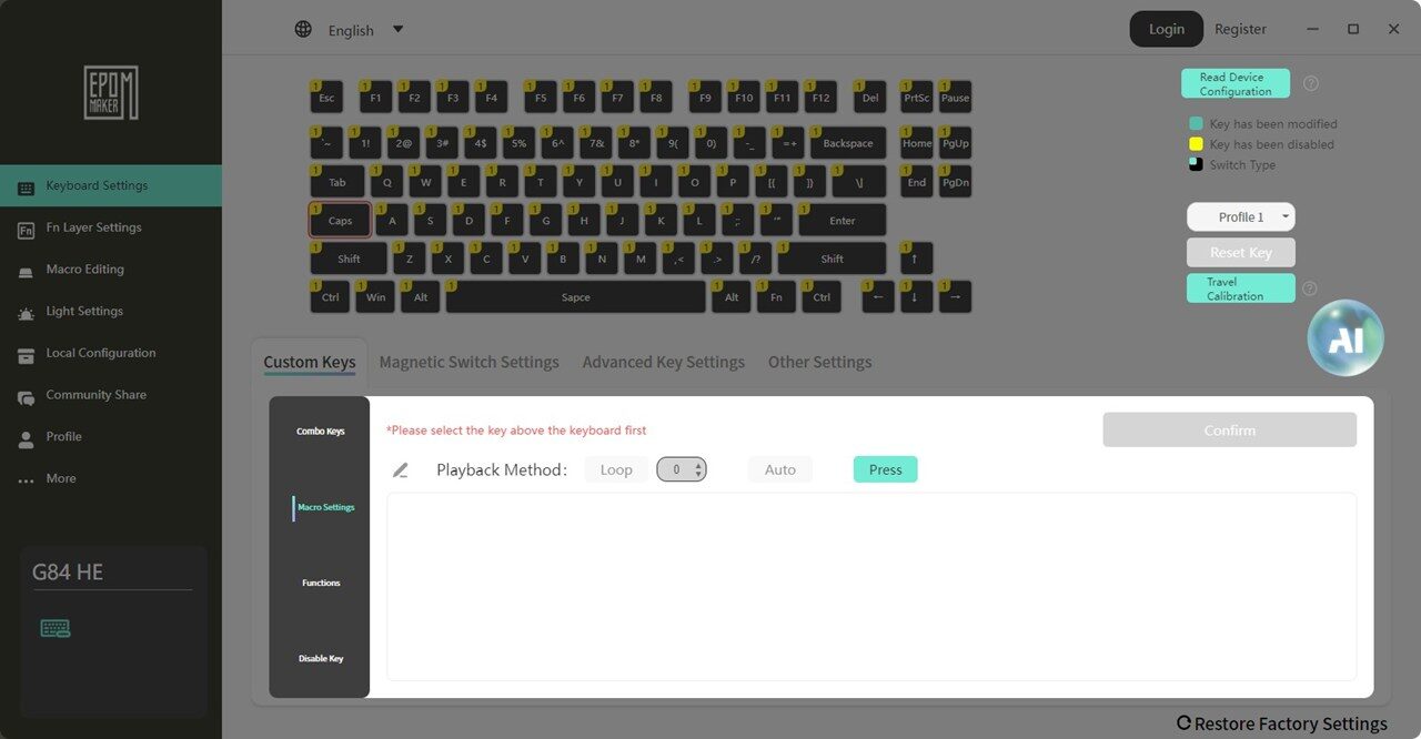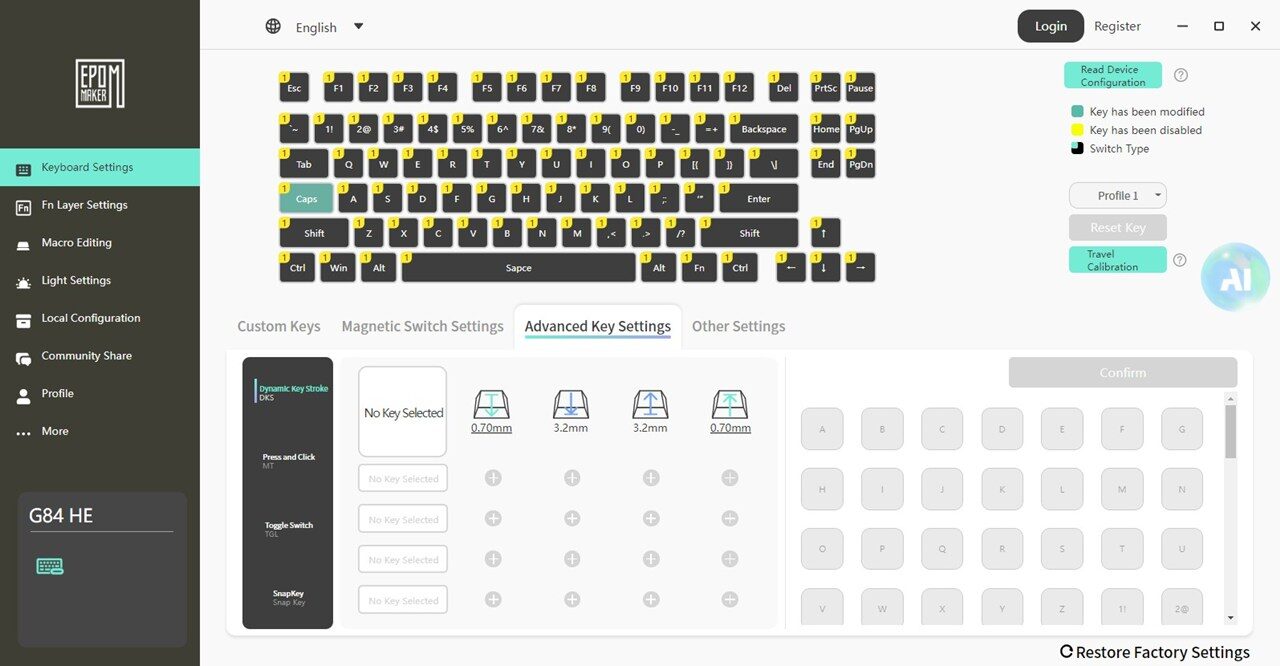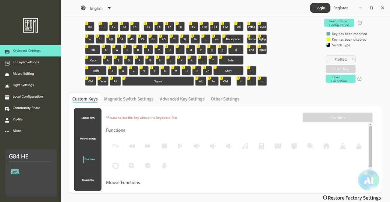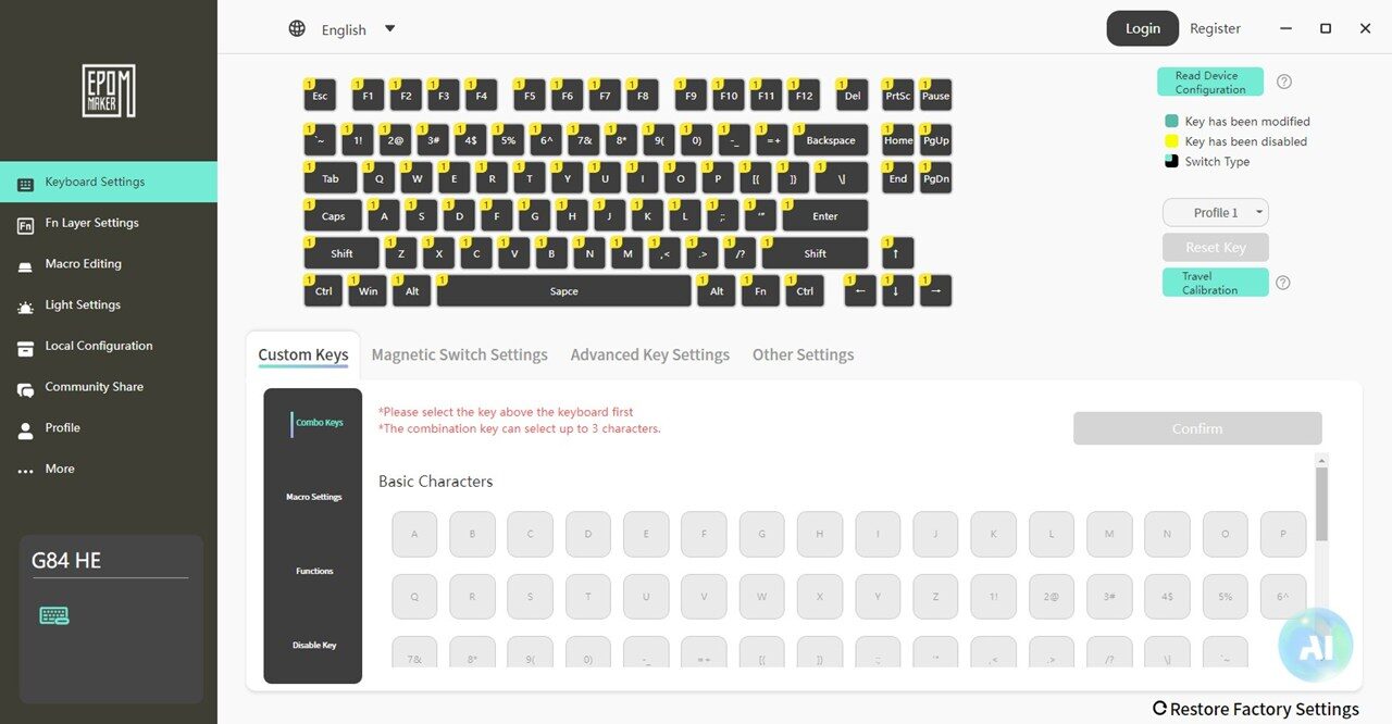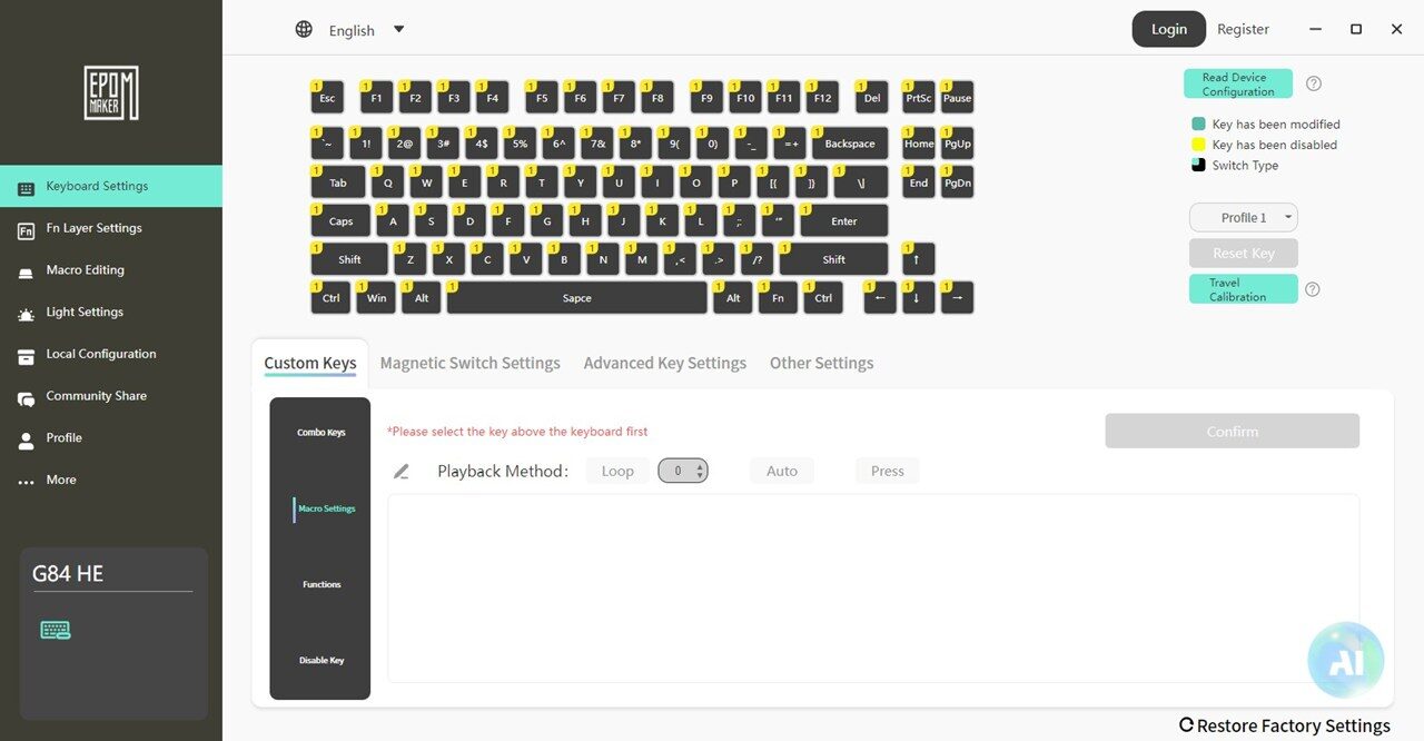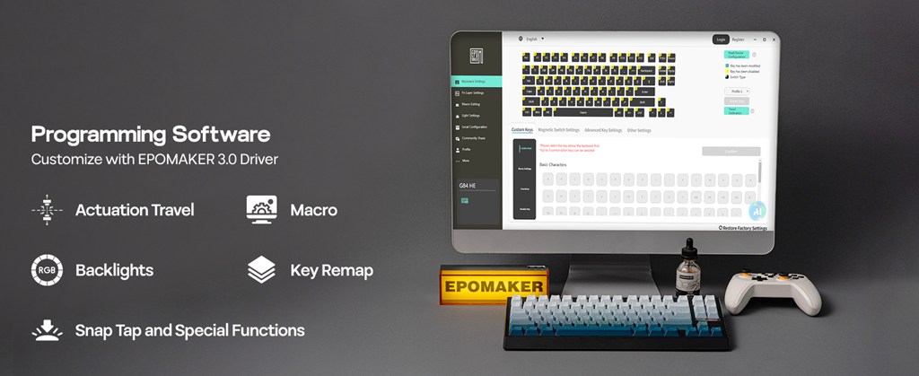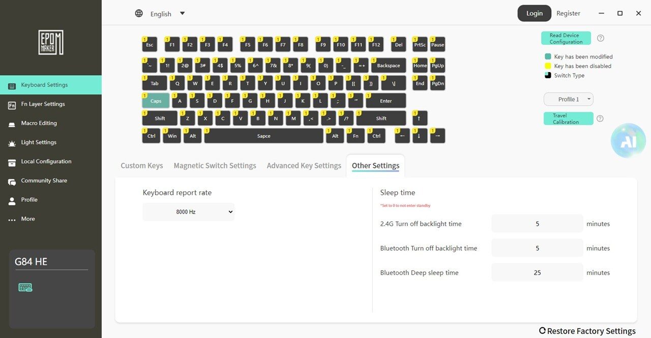 EPOMAKER G84HEは専用ソフトウェアを使って、さまざまな項目を自分好みに設定できます。