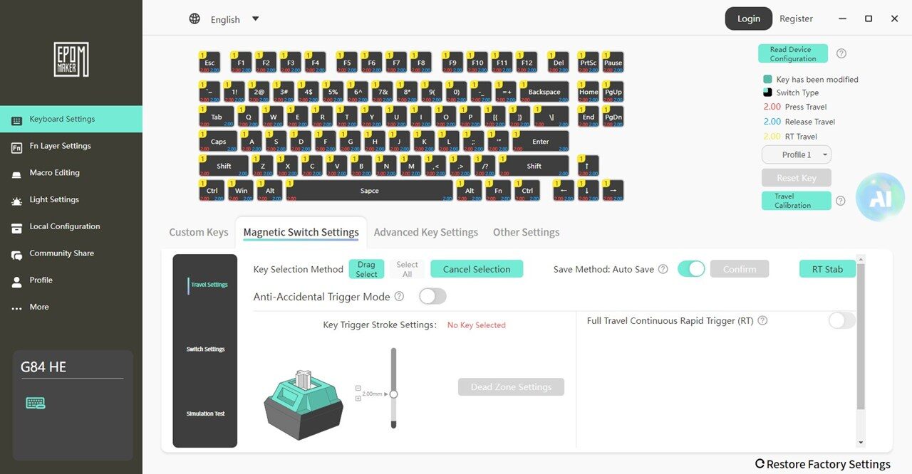 G84HEの心臓部、「Magnetic Switch Settings」です。ここでは0.1mm単位で動作点(反応する深さ)を設定したり、離した瞬間にリセットされる「ラピッドトリガー」の感度を調整します。FPSゲームでの性能が劇的に変わります。